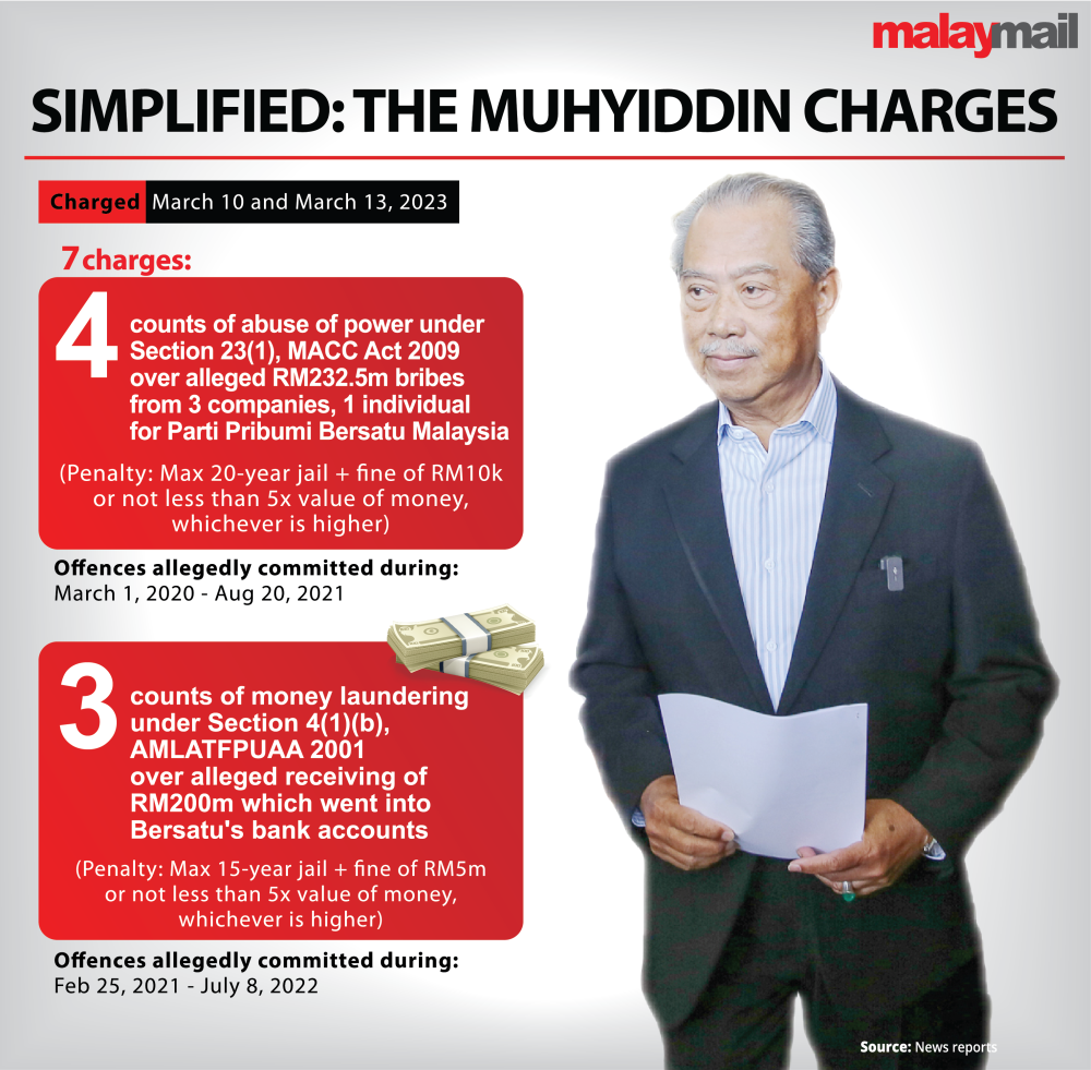 Muhyiddin was accused of four counts under the Malaysian Anti-Corruption Commission (MACC) Act for alleged abuse of power as then prime minister and president of Parti Pribumi Bersatu Malaysia for a total of RM232.5 million in alleged bribes from three companies and one individual (Bukhary Equity Sdn Bhd, Nepturis Sdn Bhd, Mamfor Sdn Bhd, Azman Yusoff) for his party during March 2020 to August 2021 period. The penalty upon conviction is a maximum 20-year jail term, and a fine of not less than five times the amount of gratification or RM10,000, whichever is higher.