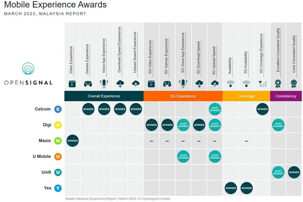 KUALA LUMPUR, March 30 — Opensignal has just released a new Mobile Network Experience Report for Malaysia which reveals some interesting findings about the state of our mobile connectivity between December 1, 2022 to February 28, 2023. During the period, Malaysia has a total of 5 telcos offering 5G services through access agreements with Digital Nasional Berhad. Despite sharing the same 5G Single Wholesale Network, the latecomers have beaten the incumbent Yes 5G which was the first to offer commercial 5G services almost a year ahead of the rest.