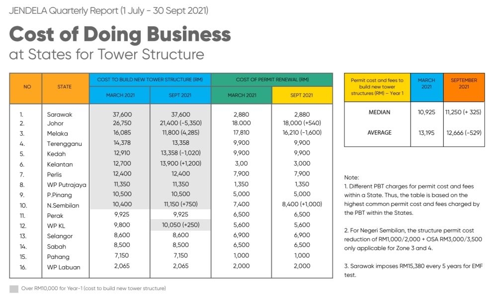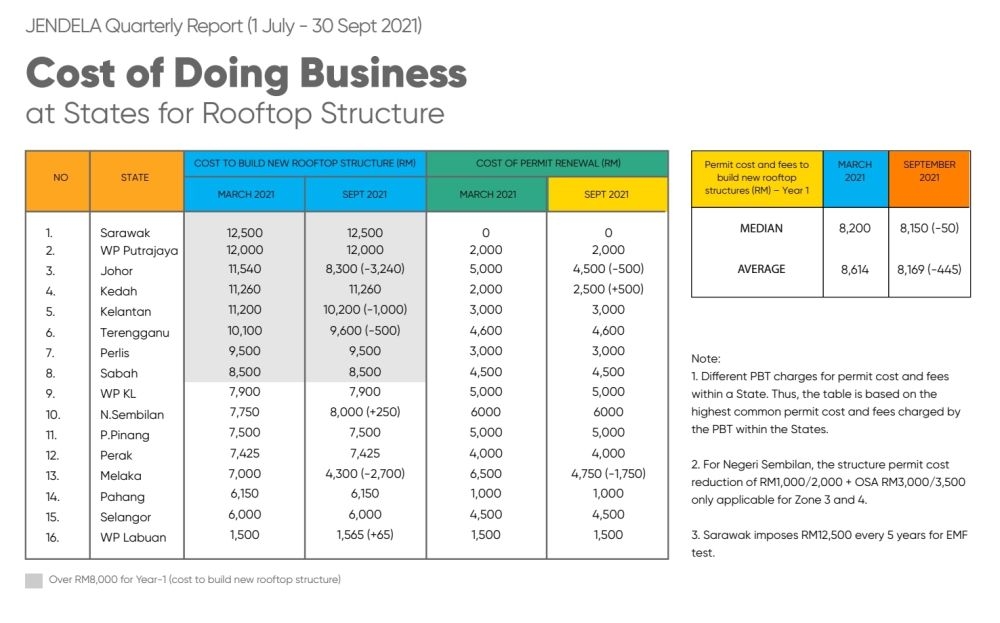 Even for rooftop structures, Sarawak still tops the list when it comes to permit fees at RM12,500 per structure, followed by Putrajaya at RM12,000 while Sabah costs even lower at RM8,500 and Selangor costs RM6,000 per site. On top of that, Sarawak imposes an EMF test fee of RM15,380 for towers and RM12,500 for rooftop structures.