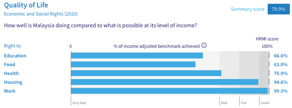 In the Human Rights Measurement Initiative’s (HRMI) Rights Tracker 2023, Malaysia scored 79.9 per cent for the “Quality of Life” section or only 20.1 per cent less than what it is capable of at its income level as of 2020.