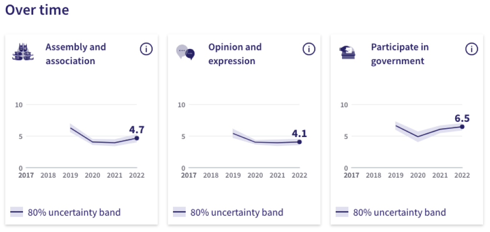 As for the right to participate in government, Malaysia scored 6.6 in 2019, dipping to 4.9 (2020), before improving to 6.1 (2021) and 6.5 (2022).