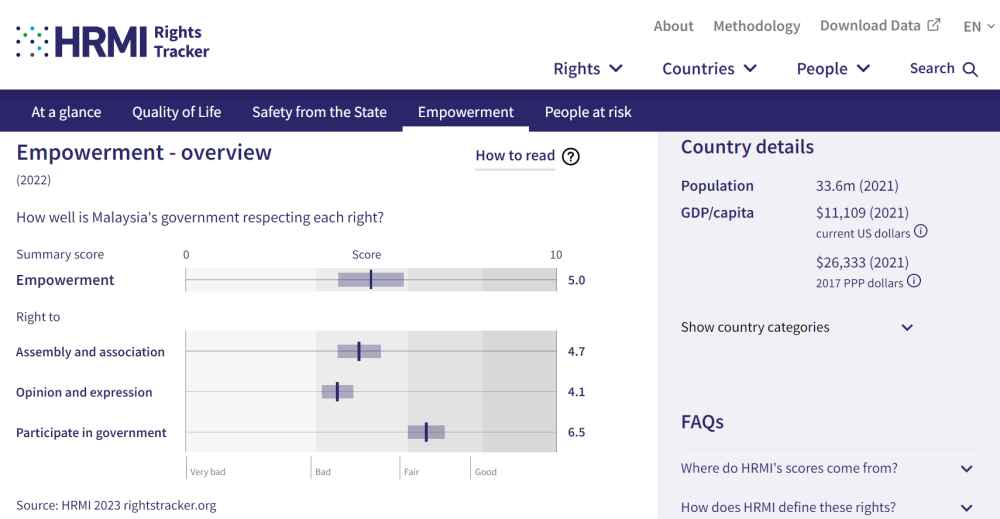 For Malaysia, the Rights Tracker measures its respect for three “empowerment” rights, namely the rights to assembly and association, opinion and expression, and to participate in government.