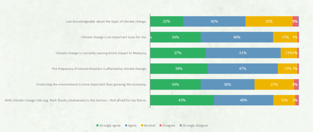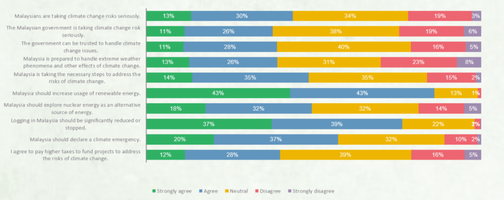 The survey saw 43 per cent believing Malaysians are taking climate change seriously, 39 per cent who think Malaysia is prepared to handle extreme weather and other effects of climate change, and 49 per cent who felt Malaysia is taking the necessary steps to address the risks of climate change.