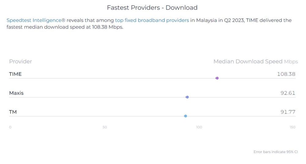 Going down to the specific telcos, Ookla crowns Time as the fastest fixed broadband provider in Malaysia with a median download speed of 108.38Mbps and it has the lowest multi-server latency of 9ms. As a comparison, Maxis takes second place with a median download speed of 92.61Mbps, followed by TM at 91.77Mbps.
