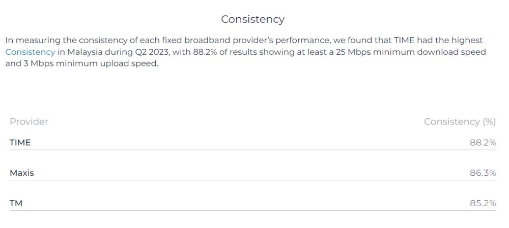 In terms of latency, Maxis also holds second place at 13ms while TM recorded 15ms. Time is also described as the most consistent fibre broadband provider in Malaysia at 88.2 per cent, followed by Maxis at 86.3 per cent and TM at 85.2 per cent.