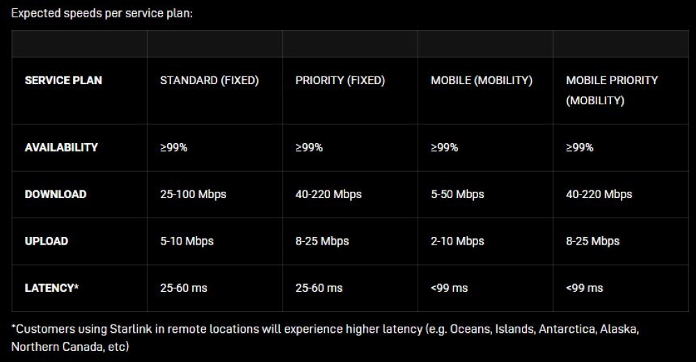 According to Starlink’s specifications, users can expect a download speed of 25-100Mbps and upload speeds of 5-10Mbps for the standard fixed plans.