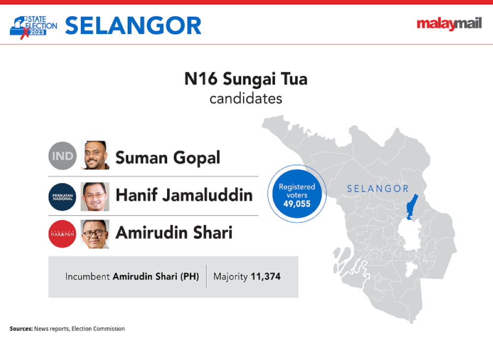 Amirudin is defending his Sungai Tua seat in a three-cornered fight against Muhammad Hanif Jamaluddin from PN and independent Suman Gopal.