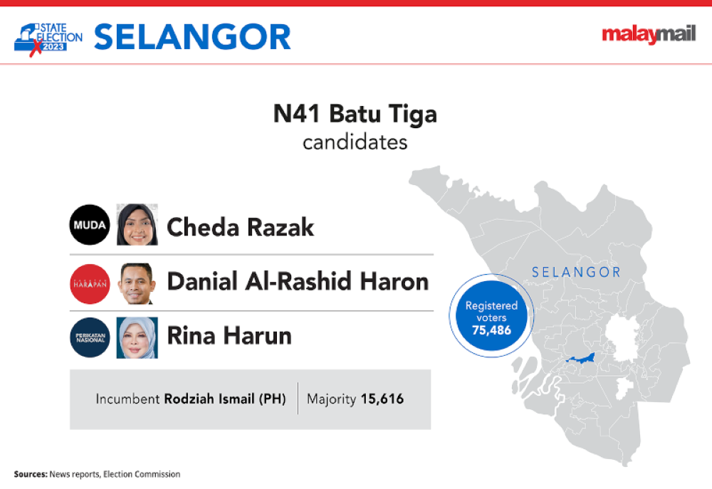 Former women, family and community development minister Datuk Seri Rina Harun is contesting the Batu Tiga seat for Bersatu. Part of the Sheraton Move in 2020, she is going against Selangor PH Youth chief Danial Al-Rashid Haron and Malaysian United Democratic Alliance’s (Muda) Saiyidah Izzati Nur Razak Maideen or known as Cheda Razak.
