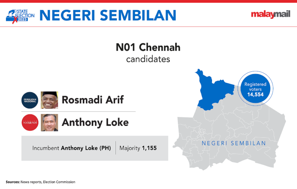 Tok Mat will contest the Rantau state seat against Rozmal Malakan from PAS while DAP secretary-general Anthony Loke is defending the Chennah seat against Rosmadi Arif from Bersatu.