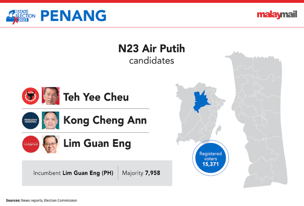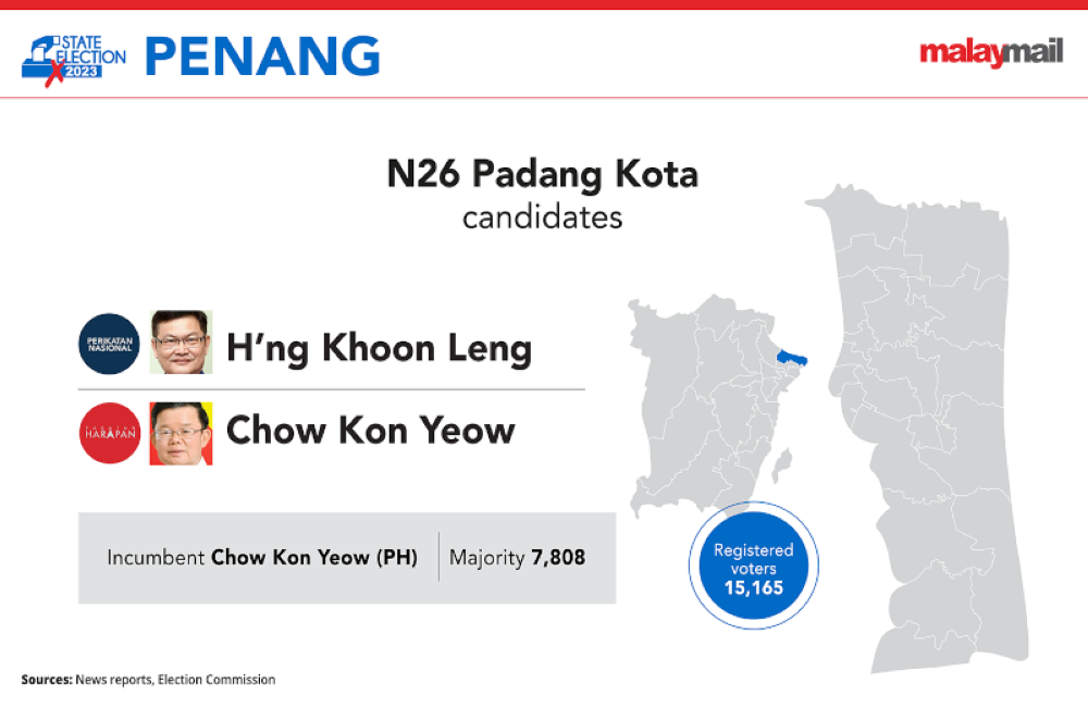 Chow will defend his Padang Kota seat against H’ng Khoon Leng from PN while DAP chairman Lim Guan Eng is standing for re-election in the Air Putih seat. He goes up against Kong Cheng Ann from PN and Teh Yee Cheu from Parti Rakyat Malaysia.