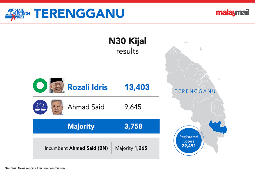 CHUKAI, Aug 12 — Terengganu Umno Liaison Body chairman Datuk Seri Ahmad Said failed to defend the Kijal seat he had held for nine terms in the Terengganu state election today.