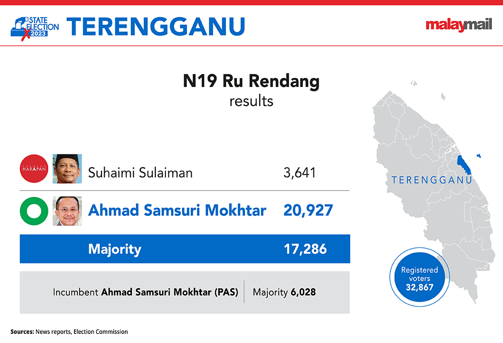 Ahmad Samsuri, who is also PAS vice-president, won with a 17,286-vote majority after garnering 20,927 votes to defeat Pakatan Harapan (PH) candidate Suhaimi Sulaiman who only obtained 3,641 votes.