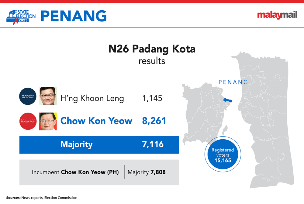 Based on results released by the Election Commission (EC) at 8.43pm, Chow, who is Penang Pakatan Harapan (PH) chairman, beat Perikatan Nasional’s (PN) H’ng Khoon Leng by a majority of 7,116 votes in a straight fight.