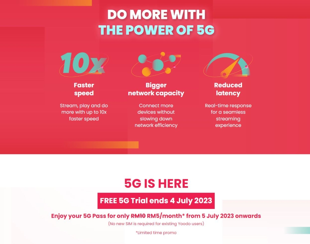 Yoodo which offered 5G services to consumers since February 2023 has started charging 5G access fee of RM10/month from July onward. However, it is currently offering the access pass at a discounted rate of RM5/month.