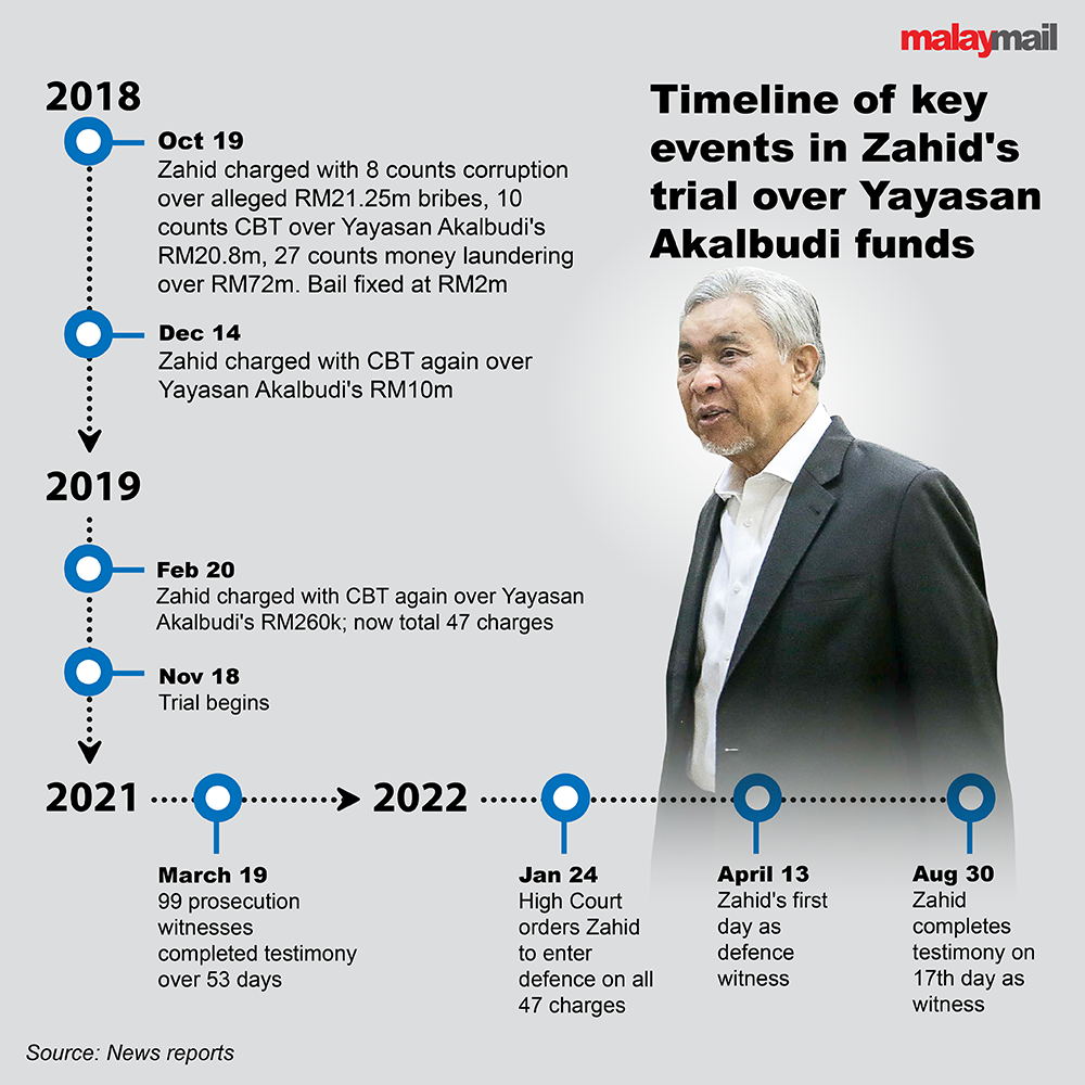 Hours earlier, the High Court granted Zahid a discharge not amounting to an acquittal (DNAA) of the dishonest misappropriation of RM31 million belonging to charitable foundation Yayasan Akalbudi as requested by the prosecution when trial resumed this morning, though it declined the defence’s request for a full acquittal.