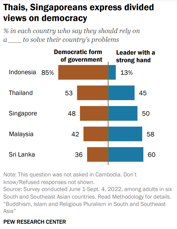 Additionally, the survey found that more of the Malaysians polled preferred a leader with a strong hand to solve Malaysia's problems at 58 per cent, while 42 per cent preferred a democratic form of government.