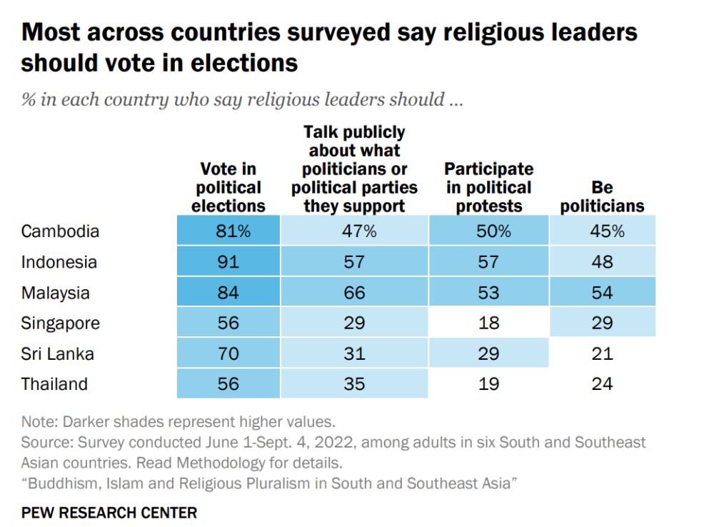 Muslims in Malaysia also topped the list in agreeing that religious leaders should join political protests (56 per cent) and "talk publicly about what politicians or political parties they support" (69 per cent).