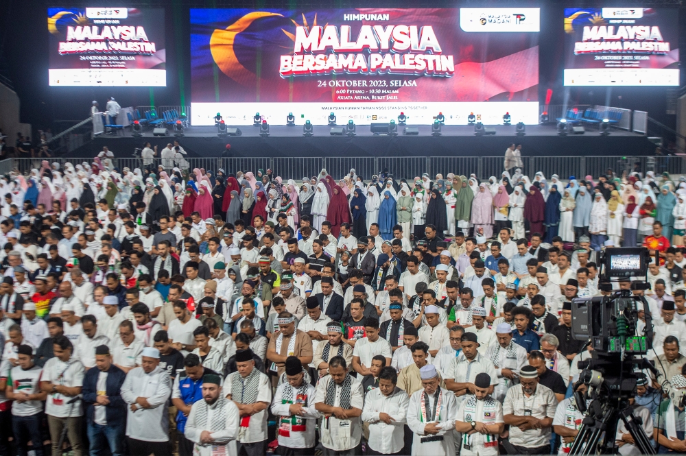 KUALA LUMPUR, Oct 25 — It might have been a wet, rainy workday, but this did not put off the thousands who made their way to the Axiata Arena in Bukit Jalil for the Malaysia Stands with Palestine Rally last night.