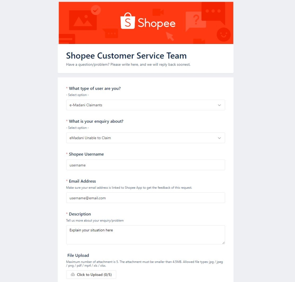 According to Shopee, if you’re certain that you meet the above criteria, you can contact their customer service to raise a dispute. Just select eMadani Claimants as your user type, select “eMadani Unable to claim” and fill in your personal details. You can attach screenshots as supporting images.