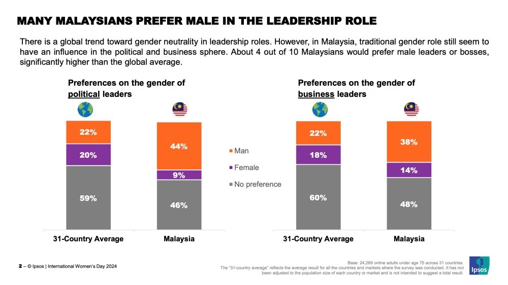 “While people across the globe generally accept leaders without much gender preference, about 4 out of 10 Malaysians would still prefer male leaders or bosses,” said Atticus Poon, its research manager on public affairs, in an accompanying statement.