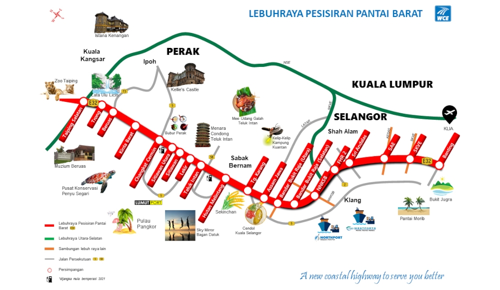 Being positioned as the alternative route to the Northern part of Peninsular Malaysia, the WCE is a 314.5km highway that starts from Banting and ends at Taiping South. At the moment, only several sections of the highway have been opened to the public including Hutan Melintang to Beruas and Bandar Bukit Raja Selatan to Assam Jawa.