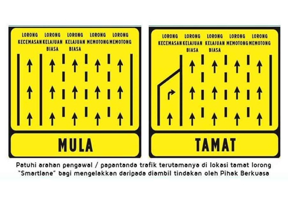 After receiving feedback, PLUS has made some changes to the Smart Lane system. A Smart Lane is indicated by big yellow signs which are placed throughout the designated area. There will be a BEGIN (Mula) and END (Tamat) sign before and after the Smart Lane, along with a reminder sign every 500 metres. PLUS has also added reminder signs 200 meters before and after the Smart Lane section.