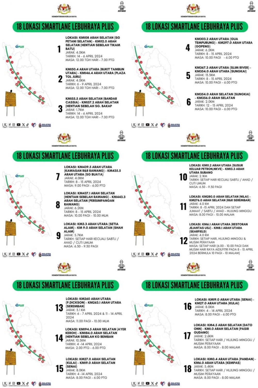 A total of 18 Smart Lanes will be activated between Johor Bahru and Sungai Petani. The active time and length of each Smart Lane varies depending on location and here’s the list of locations and schedule: