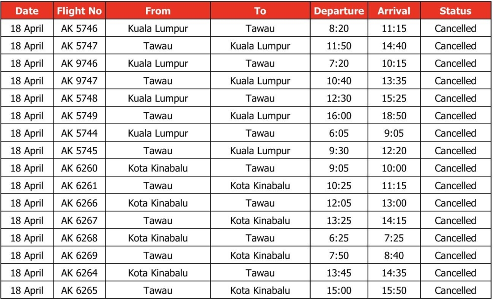 According to AirAsia, all notified guests have been notified and they encourage all guests travelling to/from affected destinations to check their registered email and mobile phones for cancellation notifications. From AirAsia’s list, a total of 16 flights for today have been cancelled consisting of Kuala Lumpur to Tawau and Tawau to Kuala Lumpur.