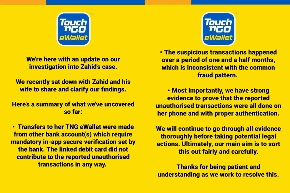The company said they have requested Zahid and his wife to update their followers on the investigation status as they have exhausted all avenues of assistance from their end. However, it said that Zahid and his wife are persisted in damaging their reputation by making defamatory statements that TNG eWallet is unsafe and wrongly portrayed their effects to update the public as shifting blame to the bank involved.