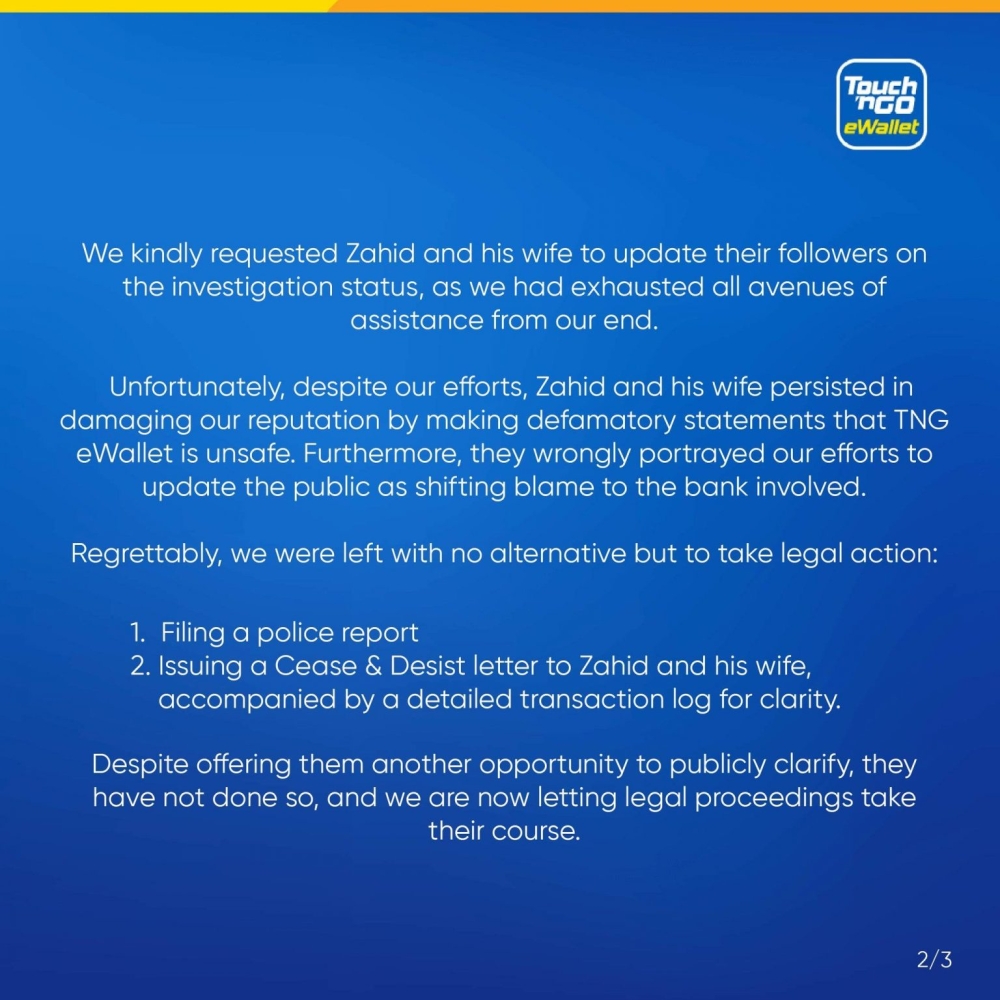 TNG eWallet also said they have been left with no alternative but to take legal action including filing a police report and issuing a Cease and Desist letter to Zahid and his wife, accompanied by a detailed transaction log for clarity. It said that despite offering them another opportunity to publicly clarify, they have not done so, and they are now letting legal proceedings take their course.