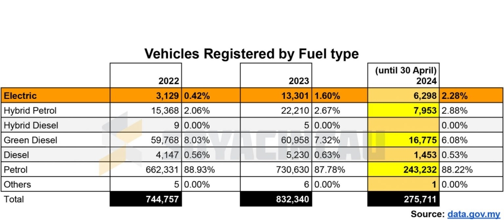 In 2023, a total of 13,301 out of 832,340 vehicles registered in Malaysia are electric (1.60 per cent). And from 1st January until 30th April 2024, a total of 6,298 out of 275,712 vehicles registered are electric (2.28 per cent).