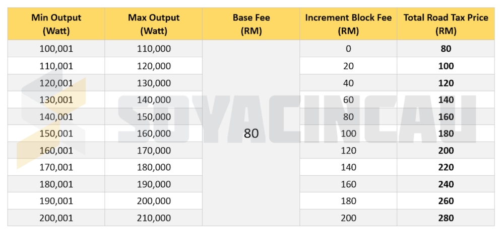 Hence, a 150kW EV will have an increment block fee of RM80. Together with a base price of RM80, you are looking at the total road tax price of RM160 for an EV with 150kW power output.