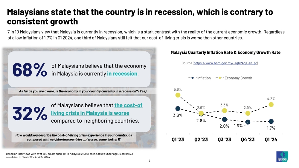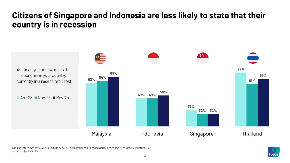 - Ipsos Malaysia found that nearly seven in 10 — 68 per cent — of Malaysians surveyed in May 2024 felt that the country is in recession