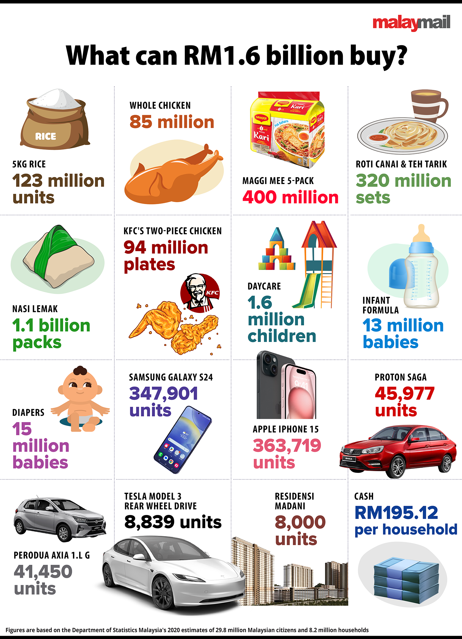 Here is a list of what RM1.6 billion could have bought, based on the Department of Statistics Malaysia’s 2020 estimates of 29.8 million Malaysian citizens and 8.2 million households.