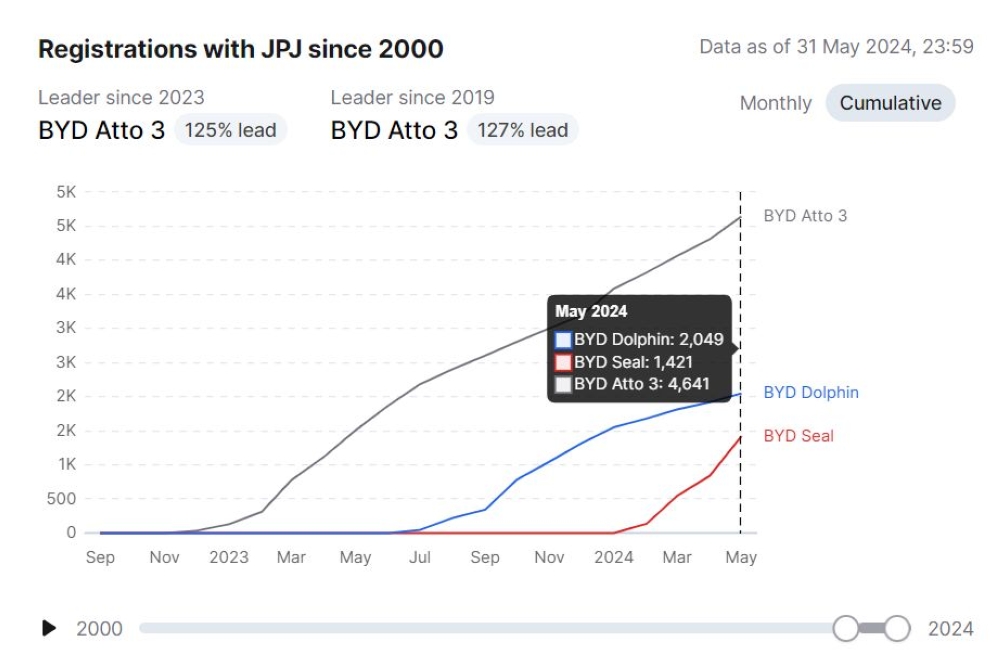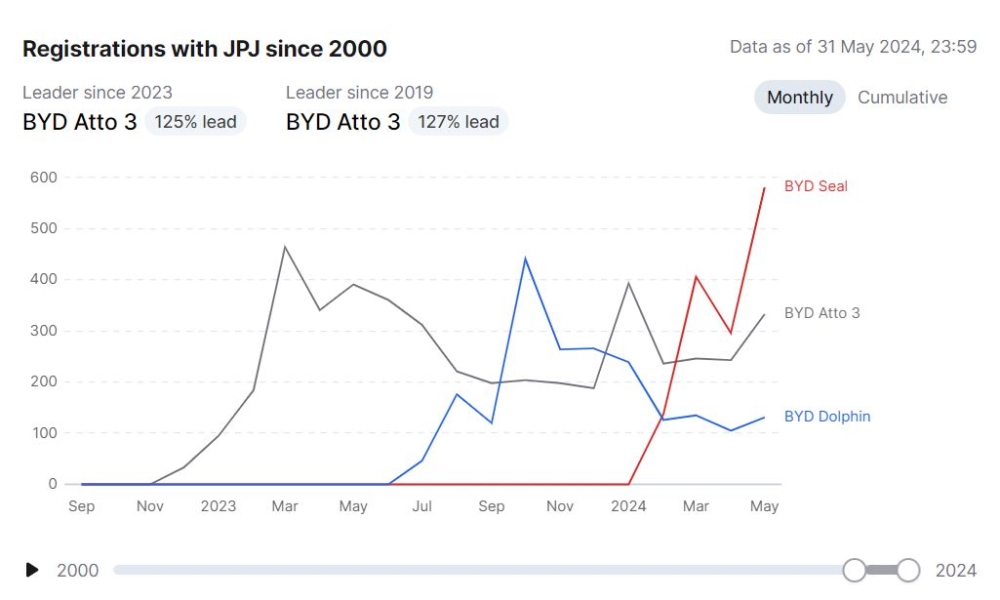 For 2024 alone until May 31, the Atto 3 SUV remains the most popular model with 1,451 registrations, followed by the BYD Seal sedan with 1,421 registrations. Meanwhile, its most affordable fully electric hatchback, the Dolphin, had a total of 736 registrations.