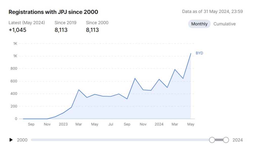 Breaking down on a month-to-month basis, May 2024 is a record high for BYD with a total of 1,045 units registered, consisting of 581 BYD Seal, 333 BYD Atto 3 and 131 BYD Dolphin.