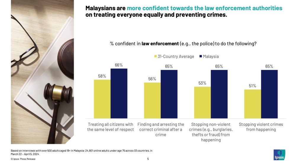 - The Ipsos Malaysia Crime Monitor report showed that Malaysians have increasing confidence in law enforcement, with 66 per cent believing police treat all citizens equally and 65 per cent expressing confidence in their ability to prevent and solve crimes.