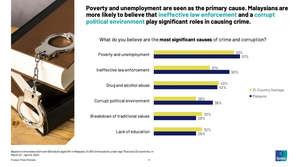 When asked about the causes of crime, 57 per cent of Malaysians pointed to poverty and unemployment, aligning closely with the 53 per cent national average.
