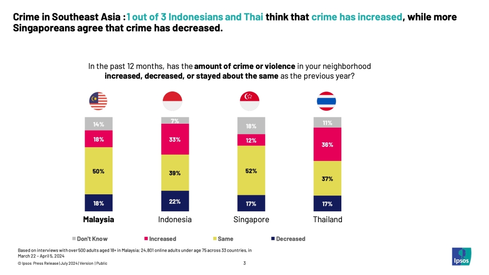 “Ipsos Malaysian Crime Monitor reveals a growing sense of security among Malaysians, with a declining perception of the rising crime rate. This positive sentiment is shared by Singapore within South-east Asia. However, concerns persist in Thailand and Indonesia, where more than a third of the population believes crime is rising.