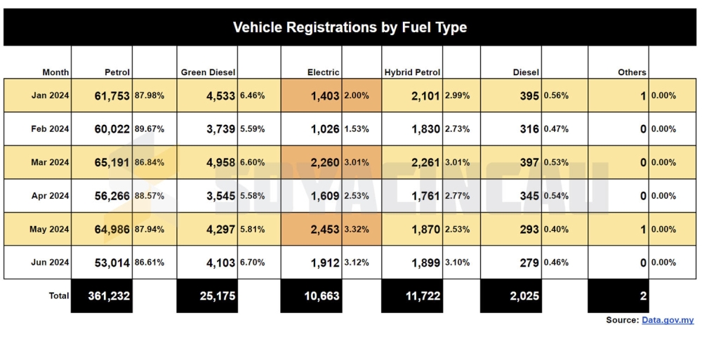 In June itself, a total of 3.12 per cent of vehicles registered are EVs, while 3.10 per cent are petrol hybrids. Petrol vehicles are still the most popular vehicle type at 86.61 per cent, followed by green diesel at 6.70 per cent.