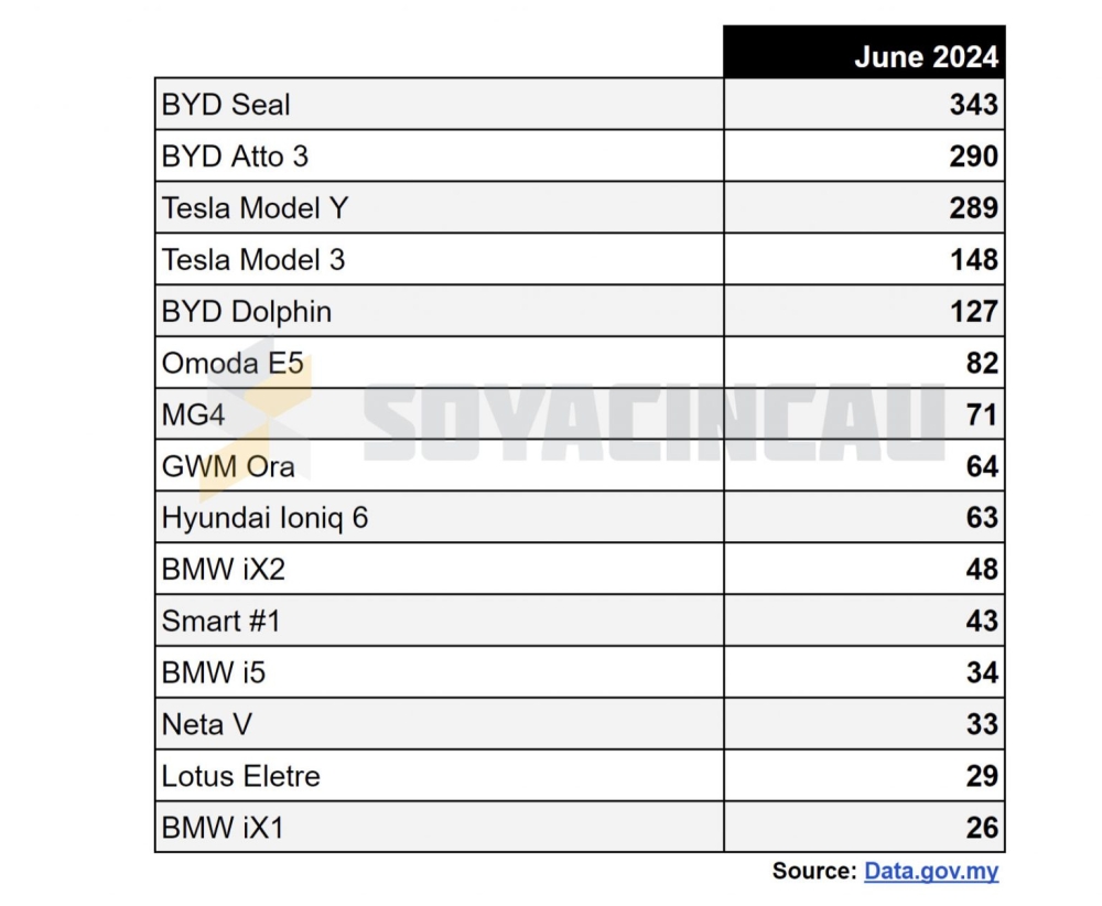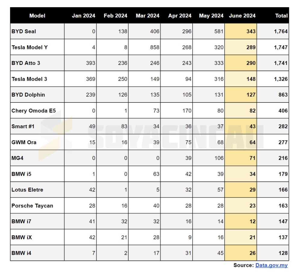 In June, BYD took the top two spots with the BYD Seal having 343 units registered followed by the Atto 3 with 290 units registered. This is followed by the Tesla Model Y and Model 3 in third and fourth place with 289 and 148 units registered respectively.