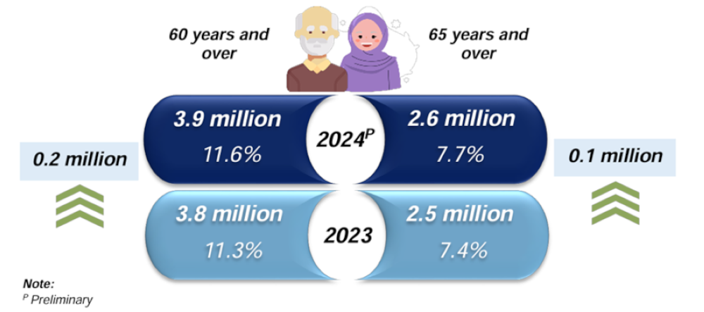 “In 2024, the population of 60 years and over has increased to 3.9 million (11.6 per cent) as compared to 3.8 million (11.3 per cent) in 2023,” the report said based on The National Senior Citizens Policy (DWEN) and the National Senior Citizens Action Plan (PTWEN).