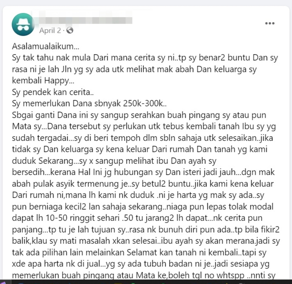 KUALA LUMPUR, Aug 6 — Driven by desperation, an individual in Malaysia has offered to sell a kidney or eye for RM250,000 to RM300,000 on Facebook to help reclaim family land that had been pawned off.