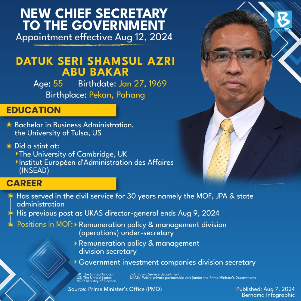 KUALA LUMPUR, Aug 7 — The King of Malaysia His Majesty Sultan Ibrahim has consented to the appointment of Datuk Seri Shamsul Azri Abu Bakar as the new Chief Secretary to the Government.