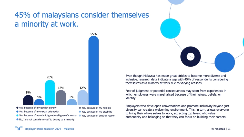 “Despite significant progress towards greater diversity, our research reveals a gap in true inclusivity in Malaysia’s working population,” Fahad Naeem, Country Director at Randstad Malaysia, said in a statement.