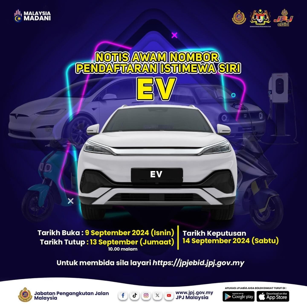 KUALA LUMPUR, Sept 9 — Besides launching the new JPJePlate which is now mandatory for new electric vehicle (EV) registrations, the Ministry of Transport (MoT) Road Transport Department (JPJ) has also launched a new special EV series number plate (EV 1 to EV 9999) which is now open for bidding.