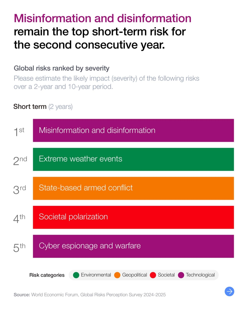 The report, based on a survey of over 900 global experts and policymakers, also named misinformation and disinformation as persistent short-term risks, threatening societal cohesion and trust in governance.