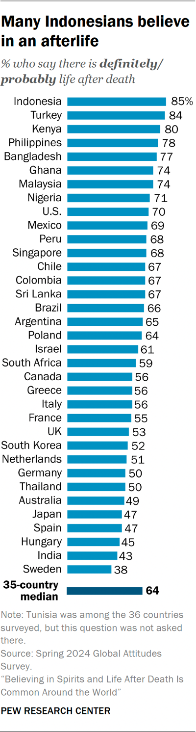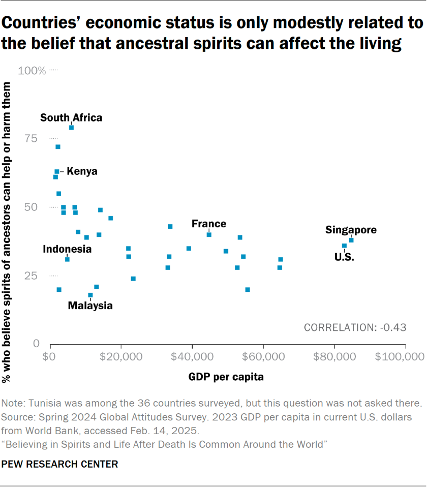 “For instance, the Muslim-majority countries of Bangladesh, Indonesia, Malaysia and [Türkiye] also are among the less wealthy countries in our survey, yet people in those countries are among the least likely to say ancestors can interact with the living in these ways.”