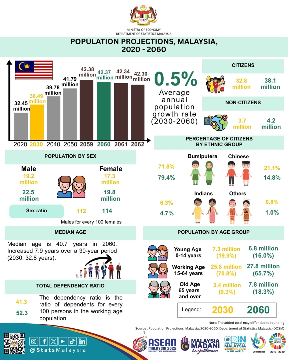 By 2060, Malaysia’s population will comprise 22.5 million males and 19.8 million females, reflecting this demographic trend.