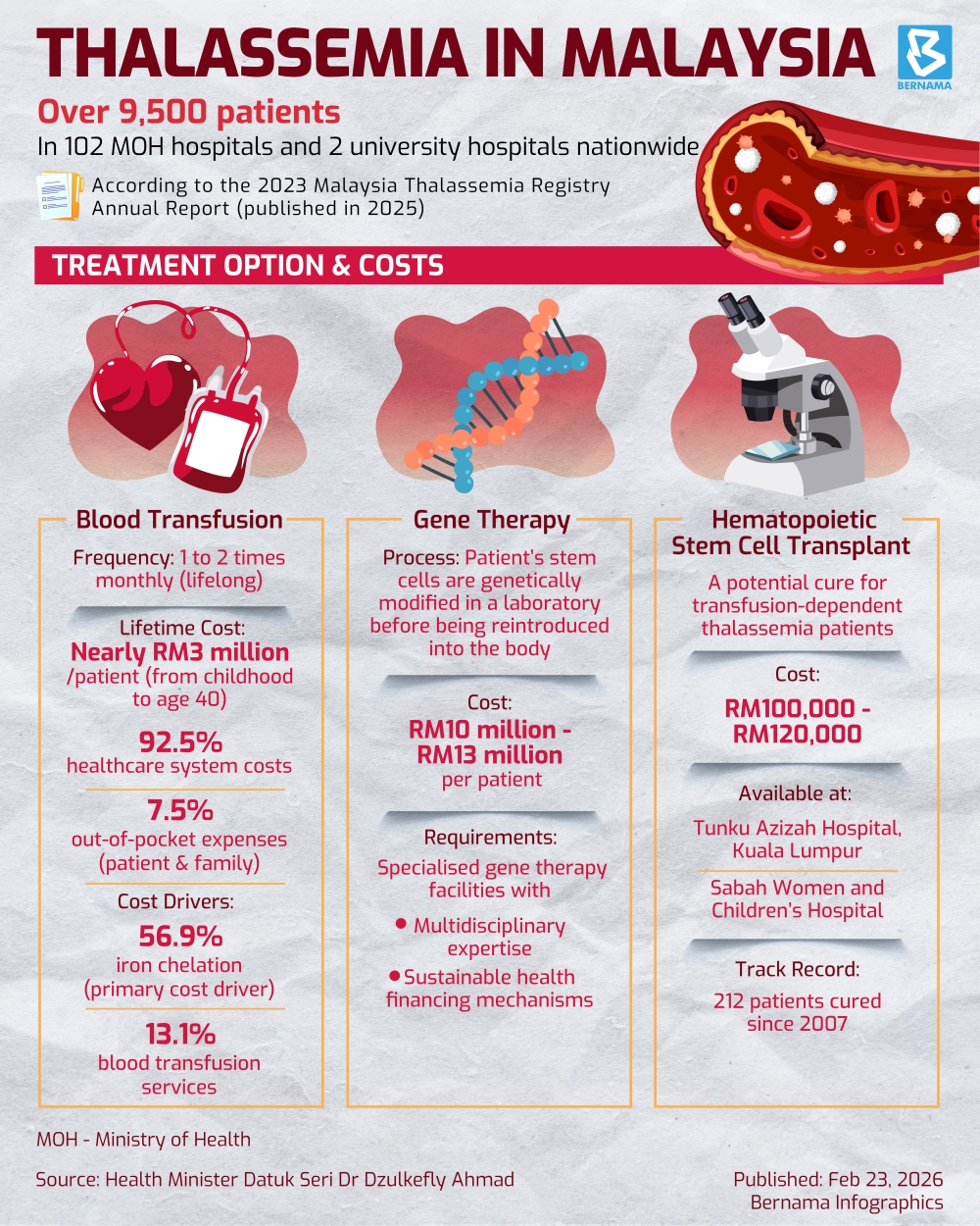KUALA LUMPUR, Feb 23 — A total of 9,554 thalassemia patients were recorded in the official data from the Annual Report of the Malaysia Thalassemia Registry 2023, published in 2025, involving 102 hospitals under the Ministry of Health (MOH), as well as two university hospitals which provide treatment for thalassemia patients.